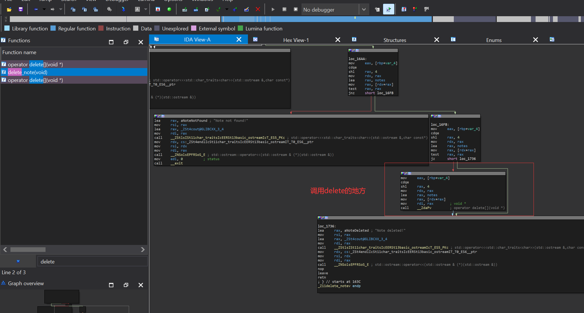 在delete_note函数中使用delete释放了new出来的chunk,但是并没有对全局变量note内存放的地址进行清零,所以会导致UAF